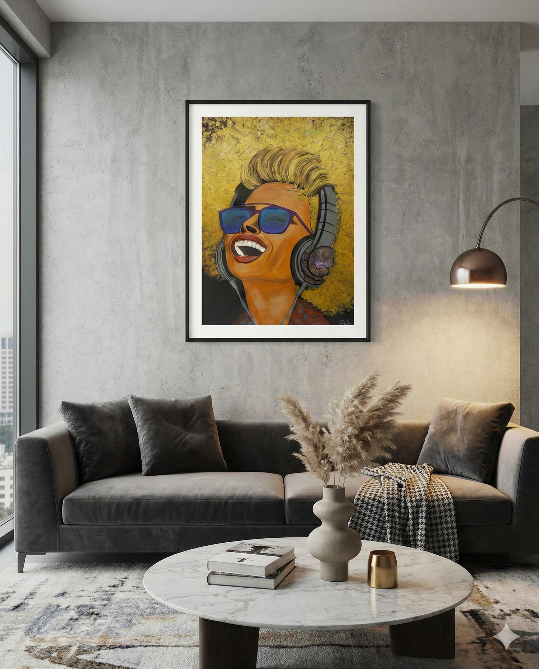 Harmonia Sonora • Esta pintura retrata uma mulher a ouvir música, ignorando as distrações ao seu redor. Focando-se apenas no que a faz feliz sem dar ouvidos a terceiros.